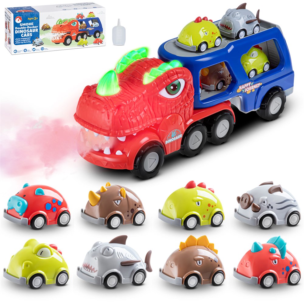 Автовоз-динозавр с набором машинок станет достойным подарком маленьким любителям игрушечного транспорта.