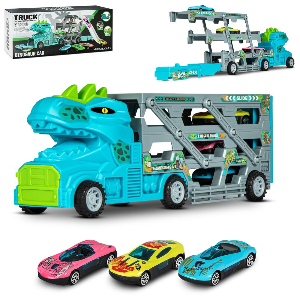 Автовоз-динозавр с транспортом,3 метал.машинки в наб.,2 трековых спуска,телескопич.платформа.