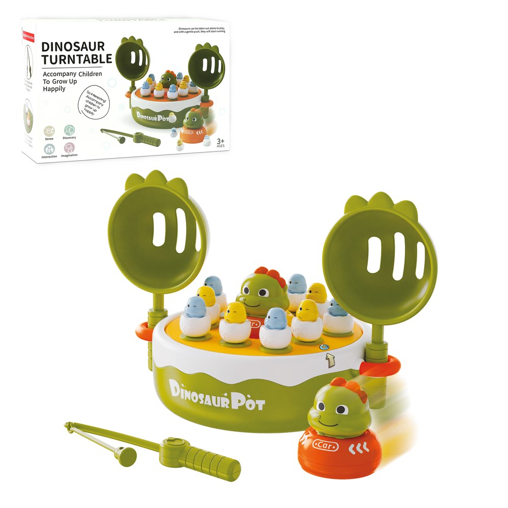 Музыкальная платформа вращается по кругу , а динозаврики прыгают и весело катапультируются в разные стороны. Малыши с восторгом будут пытаться поймать необычных созданий специальным сачком, развивая ловкость, реакцию и координацию движений. А еще дети смогут ловить динозавриков магнитными удочками или на гладкой поверхности расставлять маленьких динозавриков вместе и запускать большого динозавра прямо на них, как в игре в боулинг. На обратной стороне круглой панели находится поле для любимой всеми игры в крестики- нолики. Играя в которую, мальчики и девочки развивают логику, воображение, мышление.