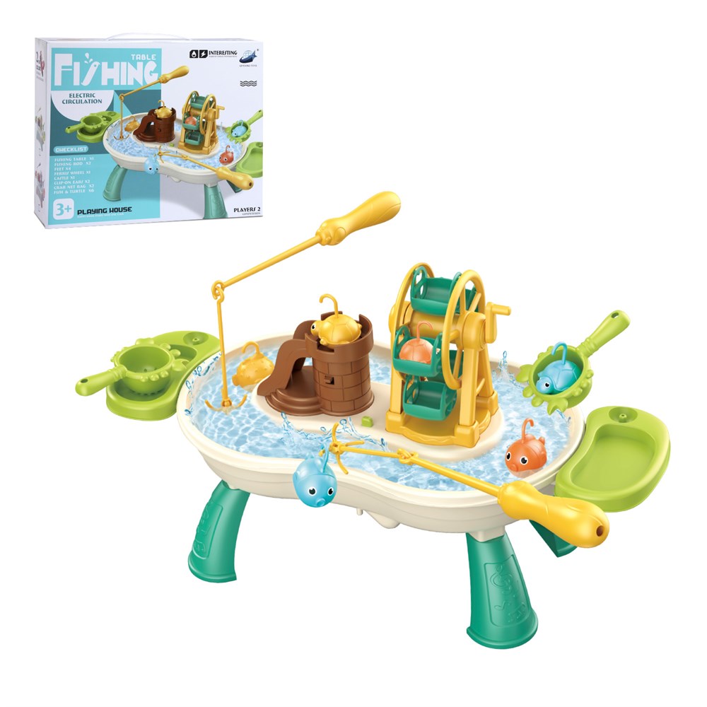 :Игровой центр "Рыбалка". Детали изготовлены из высококачественной ударопрочной пластмассы в ярких цветах. В миниатюрном бассейне, в который можно налить настоящую воду, обитают милые морские жители. Они плавают по кругу за счёт искусственного течения, создаваемого внутри бассейна маленьким моторчиком. Малышу предстоит поймать всех водных жителей при помощи магнитных удочек. Для того, чтобы игра была ещё веселее, в игровом центре есть музыка и подсветка. В комплекте также прилагаются 2 совочка и мельница для увлекательных игр с водой! Играть можно одному или устроить захватывающие соревнования в компании. В комплект входит: ванночка для воды, 2 удочки, фигурки рыбок и черепашек, горочка с башней и лестницей. Игры с набором развивают воображение, мышление, внимание, память, коммуникативные навыки, мелкую моторику, пространственную ориентацию и координацию движений, расширяют кругозор. Игровой набор станет прекрасным подарком для детей на Новый год или День рождения. Работает от батареек 3*АА