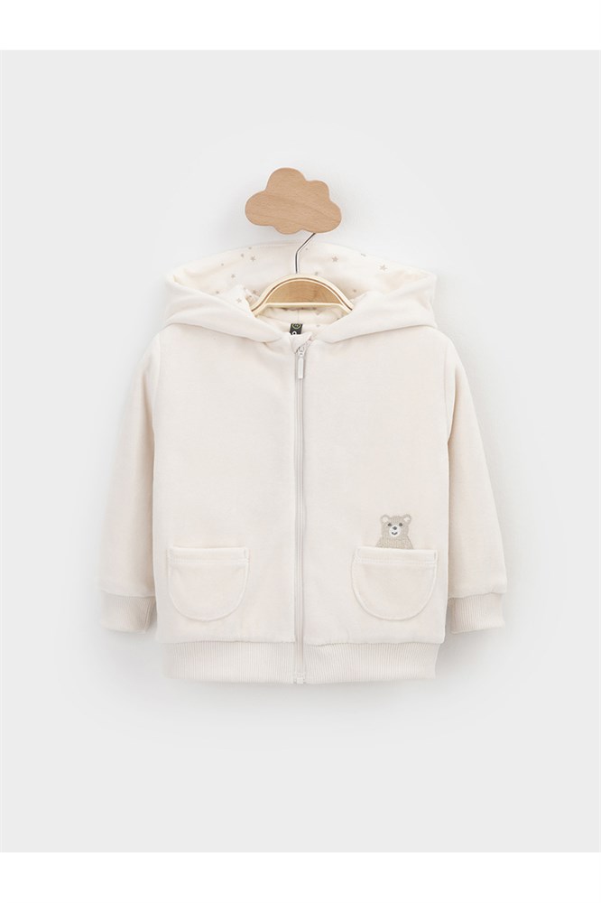 Тёплая куртка из велюра для новорождённых. Внутри синтепон и подклад из натурального хлопка. Изделие застёгивается на молнию и имеет капюшон. На рукавах мягкие манжеты, внизу - эластичный пояс. Спереди два накладных кармана и украшение в виде вышивки. Все трикотажные полотна производятся в соответствии с нормами Швейцарского сертификата ЭкоТекс.