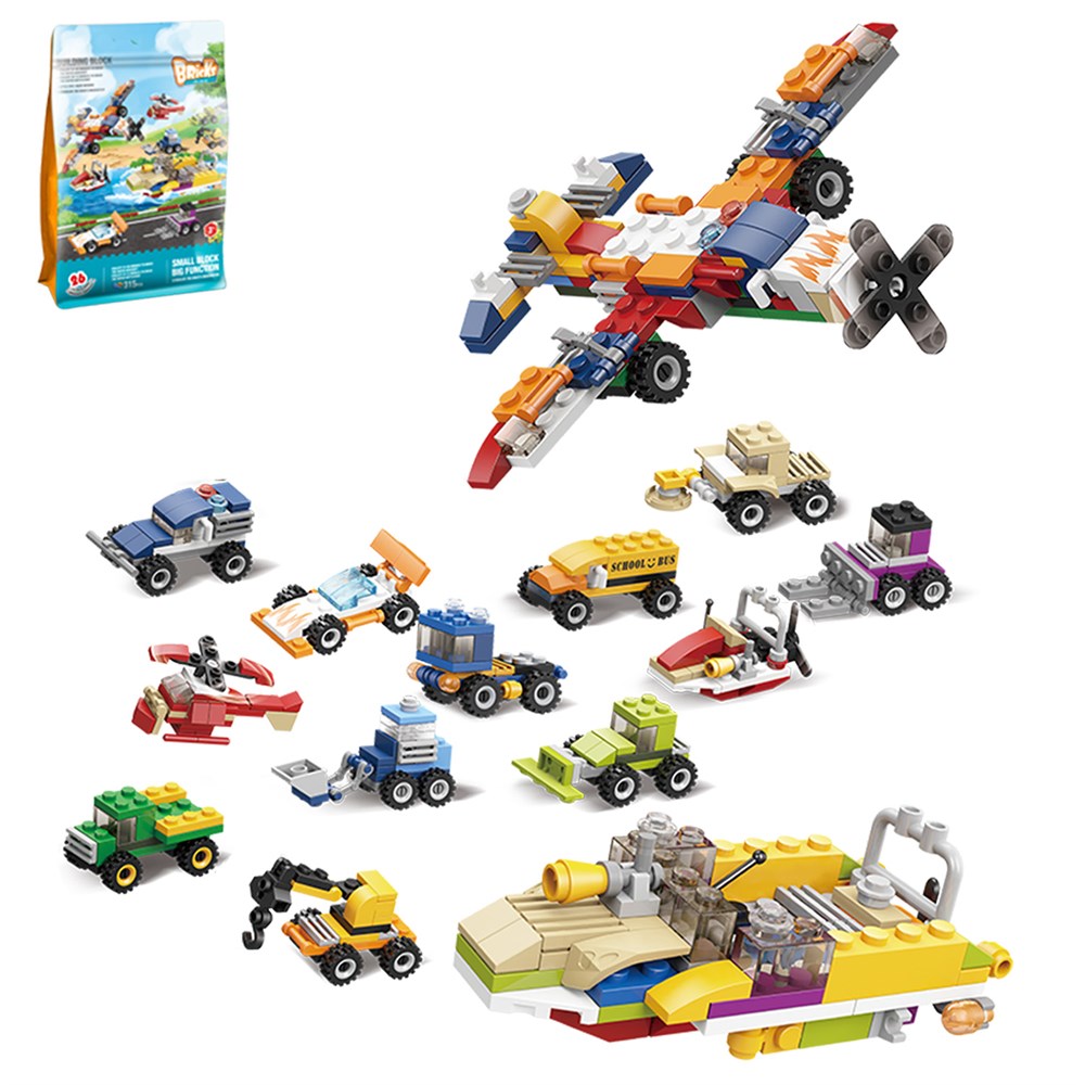 В комплекте вы найдёте различный транспорт, такой как подъёмный кран, поломоечная машина, экскаватор, погрузчик, вертолёт, грузовики, трактор, школьный автобус, катер, гоночная машина, полицейская машина. Все модели легко собираются и разбираются, а специальный ключ поможет в разборе, если что-то пошло не по плану.