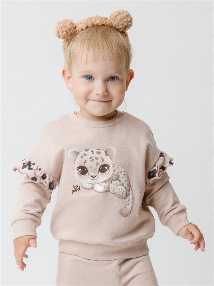 Мягкий свитшот с воздушными воланами для девочки. Изготовлен из высококачественного футера с начёсом. Обтачка горловины, манжеты и пояс выполнены из эластичного полотна. Для удобства имеется застёжка на кнопки. Оригинальный принт выполнен из стойких текстильных красителей. Свитшот сохраняет форму и стойкий цвет после многочисленных стирок. Все трикотажные полотна производятся в соответствии с нормами швейцарского сертификата ЭкоТекс.