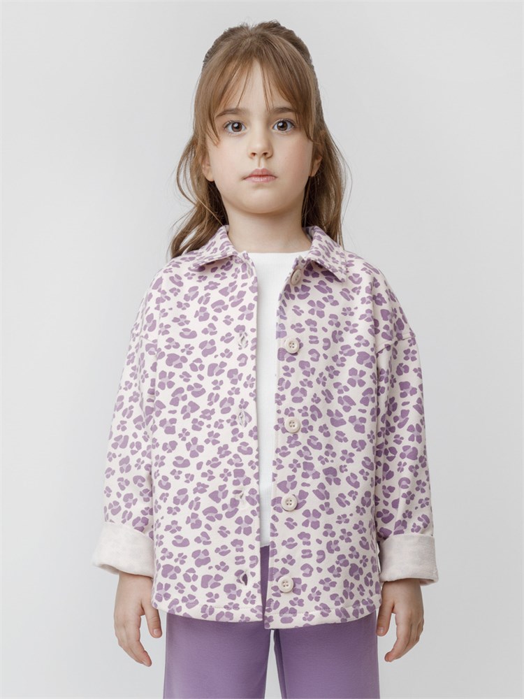 Свободная трикотажная рубашка для девочки из мягкого петельчатого футера. Застёгивается на пуговицы. Модель с закруглённым низом и спущенным плечом. Изделие сохраняет цвет и форму после многократных стирок. Все трикотажные полотна производятся в соответствии с нормами швейцарского сертификата ЭкоТекс.