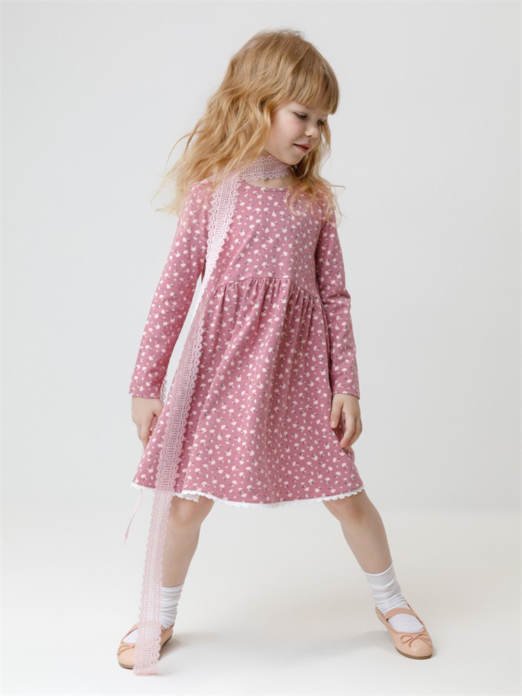 Платье для девочки с длинными рукавами из высококачественного гладкого трикотажа. Для удобства одевания на спинке платье застёгивается на пуговицу. Украшено кружевом. Платье сохраняет форму и стойкий цвет после многочисленных стирок и идеально подходит на каждый день. Все трикотажные полотна производятся в соответствии с нормами швейцарского сертификата ЭкоТекс.