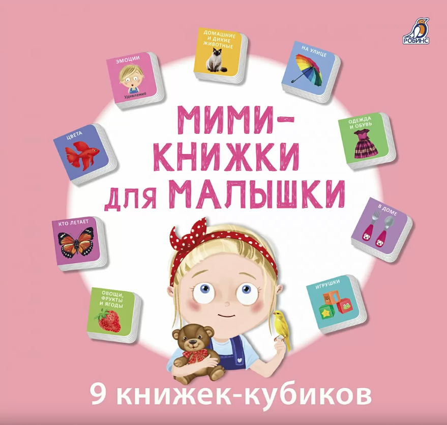 "Набор книжек-кубиков «Мини-книжки для малышки» предназначен для девочек, которые только начинают познавать мир и произносить первые слова. Внутри вы найдёте 9 мини-книжек со 100 яркими картинками на самые важные первые темы, которые помогут малышке познакомиться с окружающим миром и запомнить новые слова.