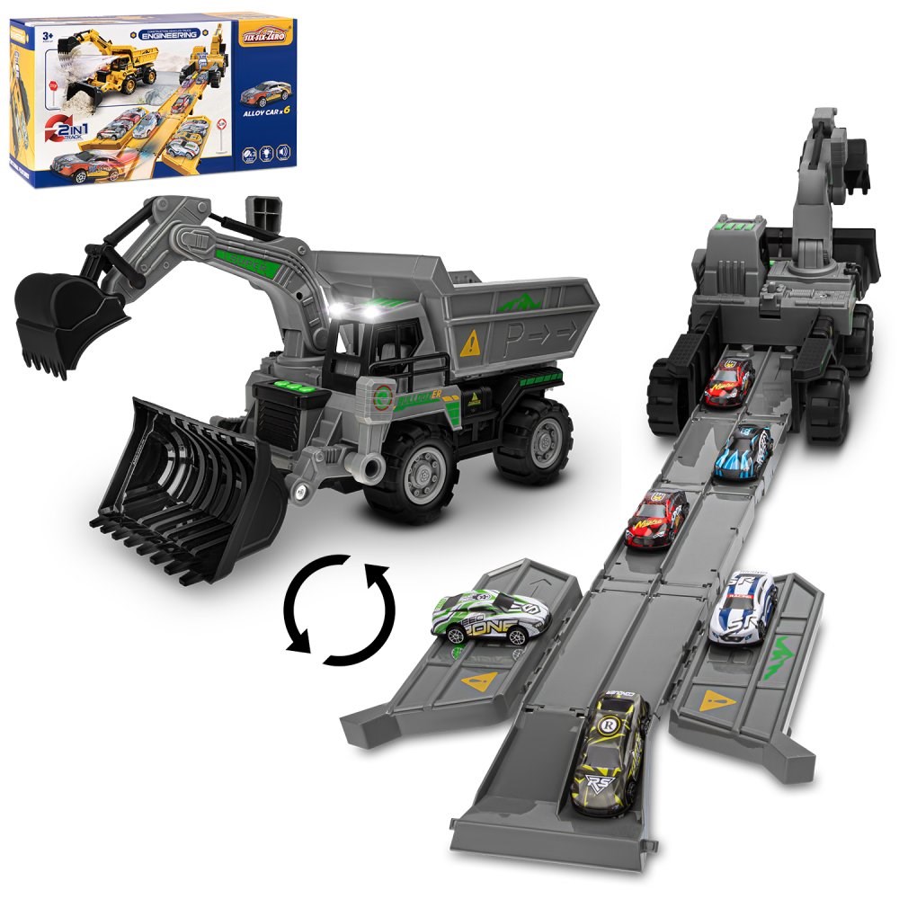 Карьерный самосвал-трек 4 в 1 — это не просто игрушка, а целый игровой мир, который подарит ребёнку часы увлекательных приключений и незабываемых эмоций. Игровой набор совмещает в себе сразу несколько видов техники: мощный карьерный самосвал, экскаватор, бульдозер и полноценный гоночный трек, который легко раскладывается прямо из кузова самосвала. Внутри ребёнка ждёт настоящее открытие — целых шесть стильных металлических машинок, каждая из которых выполнена с яркими принтами.