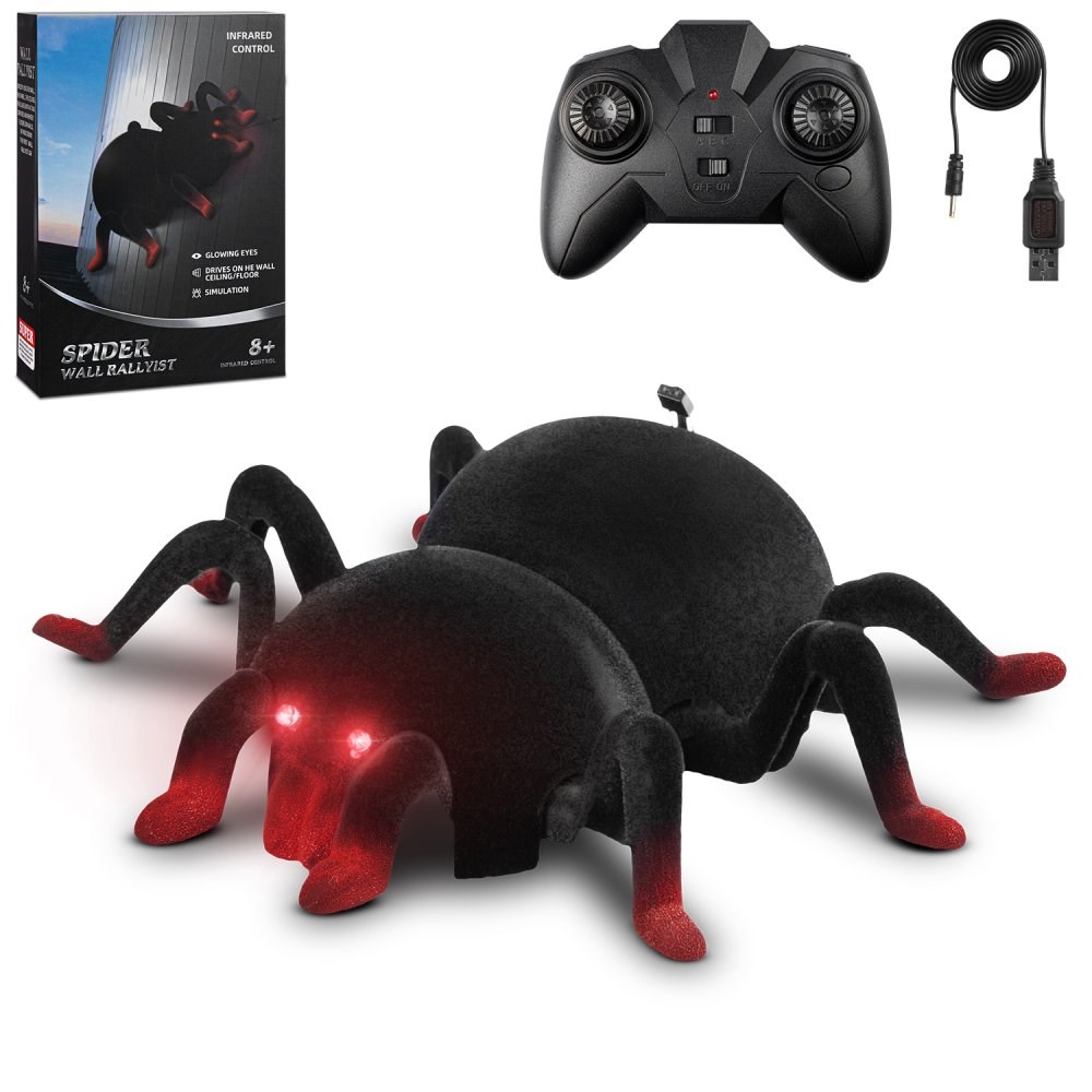 Радиоуправляемый паук способен двигаться по любой поверхности. Управляется пультом. Игрушка может взбираться по отвесной стене, крутиться на 360 градусов. Глаза светятся.