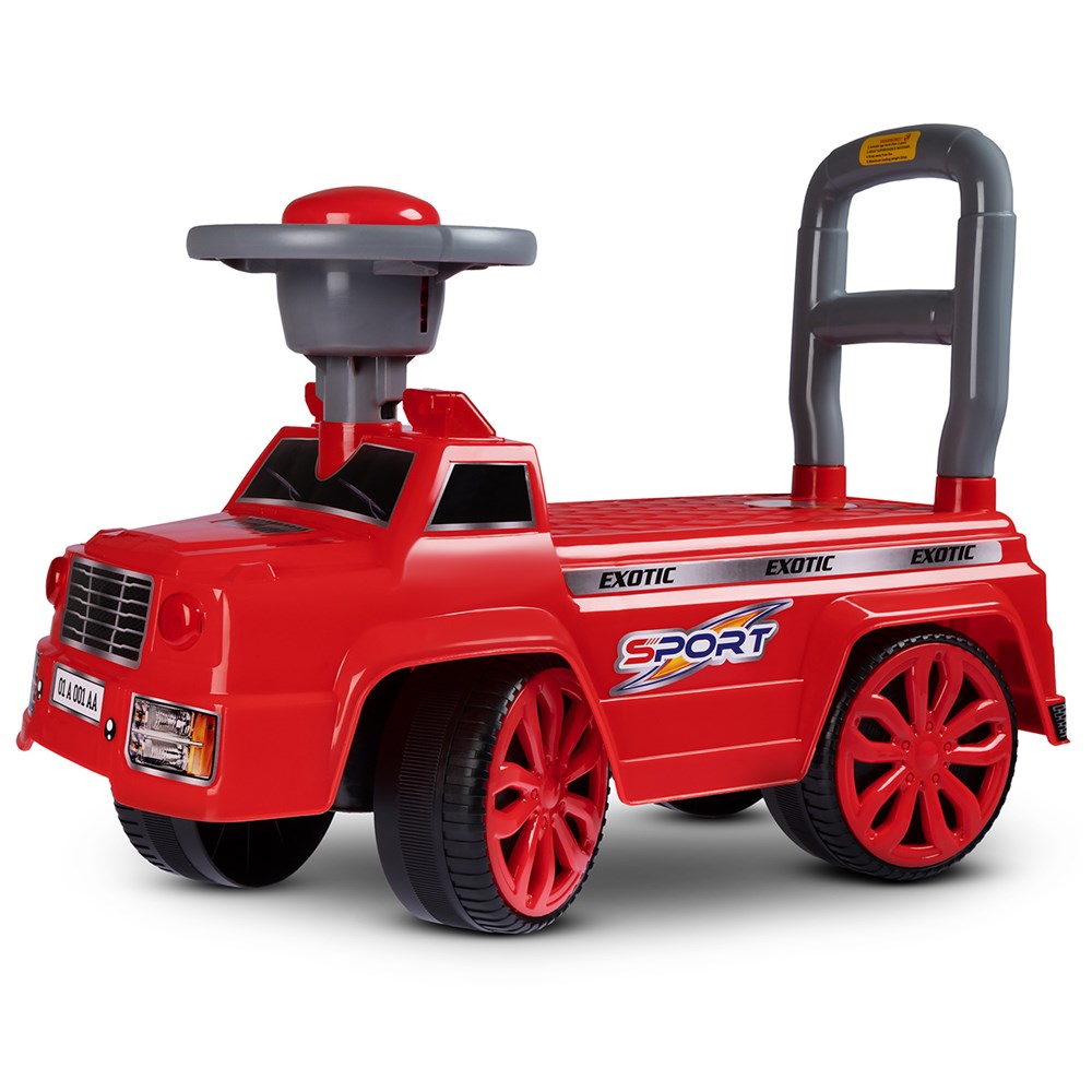 • цветные наклейки, стильный и реалистичный дизайн, имитация фар, литых дисков, руль с пищалкой сделают толокар по-настоящему любимой игрушкой;