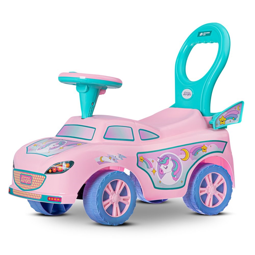 • Цветные наклейки единорогов, реалистичный дизайн, веселая музыка, сделают каталку по-настоящему любимой игрушкой.