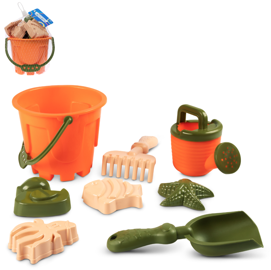 В песочный набор входит всё самое необходимое для весёлой игры: ведёрко для песочницы, лейка детская, лопатка, грабли и 4 формочки для песка.