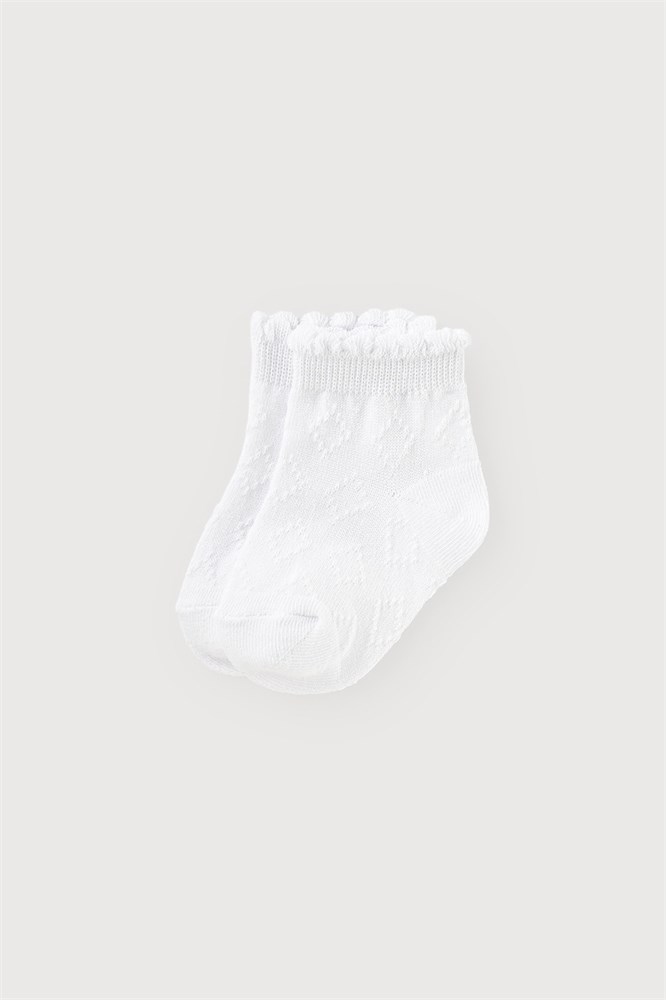 Короткие нарядные носочки для девочки. Эластичная резинка по верхнему краю. Украшены ажурным рисунком в ромбик.
