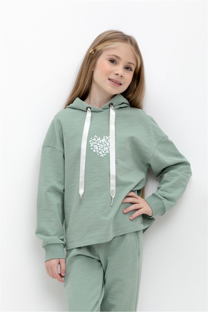 Джемпер с капюшоном для девочки из петельчатого футера . Принт выполнен из высококачественных текстильных красителей.