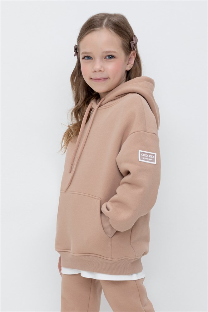 Худи с капюшоном для девочки из футера трехнитки с начесом. Манжеты и пояс выполнены из эластичного полотна. Спереди удобный карман-кенгуру.